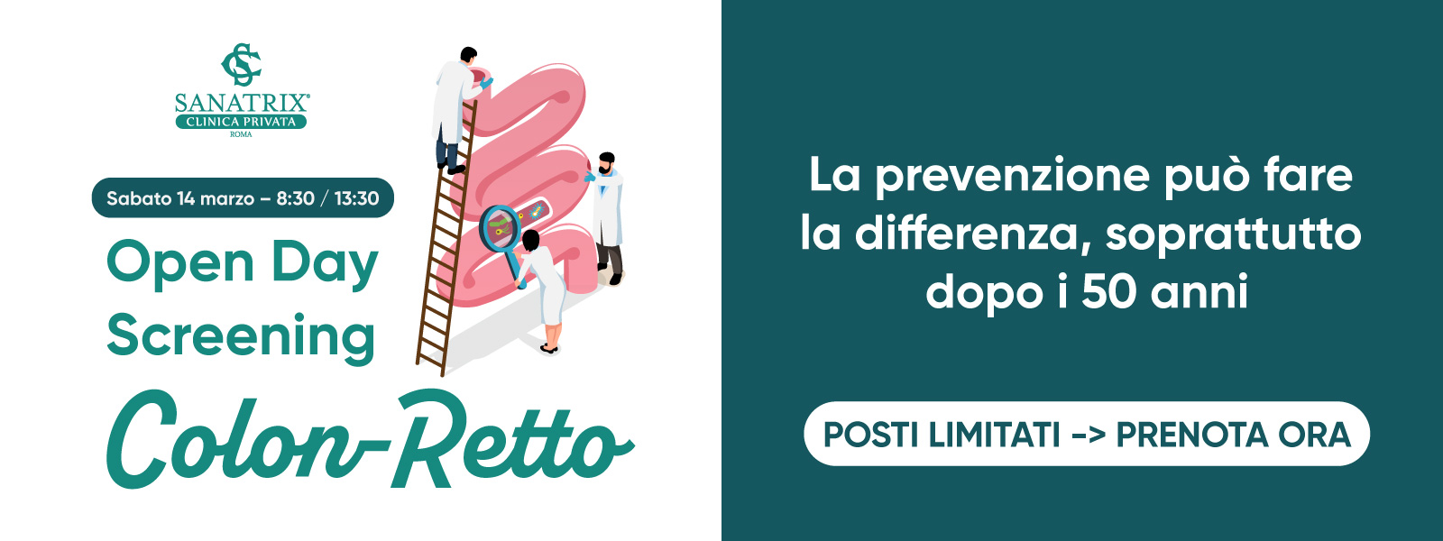 Prendersi cura della propria salute significa anche anticipare ciò che non dà sintomi. Il tumore del colon-retto è una delle patologie oncologiche più diffuse, ma anche una di quelle per cui la prevenzione e la diagnosi precoce possono fare davvero la differenza, consentendo interventi tempestivi ed efficaci. Per questo, la Clinica Sanatrix dedica una mattina alla prevenzione con un Open Day Screening Colon-Retto , pensato per offrire un percorso completo, in un contesto medico altamente specializzato. Sabato 14 Marzo Durante l’Open Day sarà possibile accedere a un pacchetto di screening completo a tariffa agevolata di € 100,00, che include: