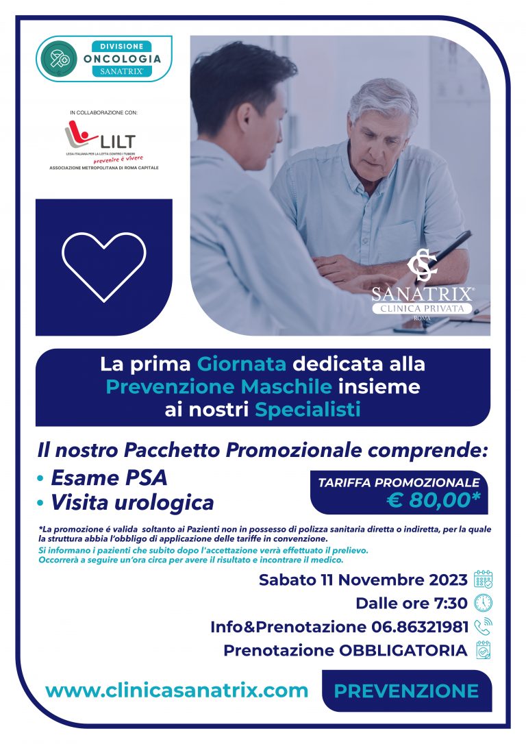 Sabato 11 novembre dalle 7:30 in poi sarà possibile effettuare una visita urologica ed un test del PSA in promozione a 80 € complessivi valido soltanto ai pazienti non in possesso di polizza sanitaria diretta o indiretta, per la quale la struttura abbia l’obbligo di applicazione delle tariffe in convenzione.