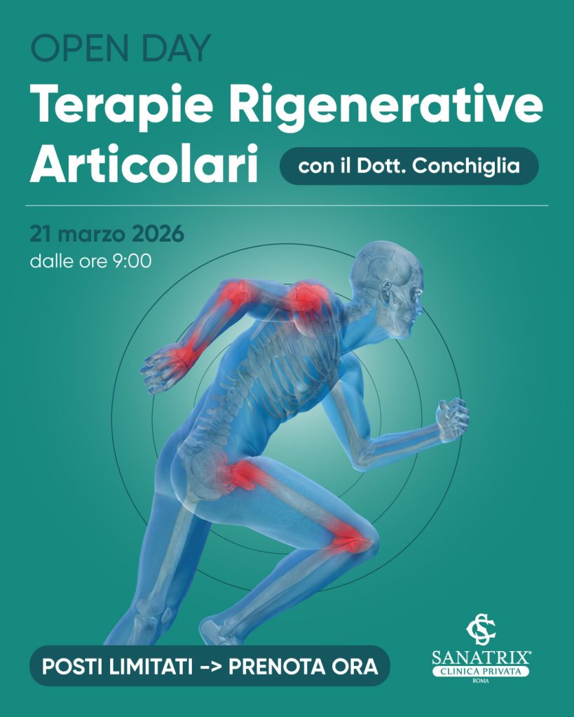 Sabato 21 marzo la Clinica Sanatrix organizza un Open Day dedicato alla salute delle articolazioni, con visite specialistiche del Dr. Conchiglia per la valutazione di patologie di spalla, ginocchio e anca e informazioni sulle possibili opzioni terapeutiche, tra cui la medicina rigenerativa con cellule staminali.